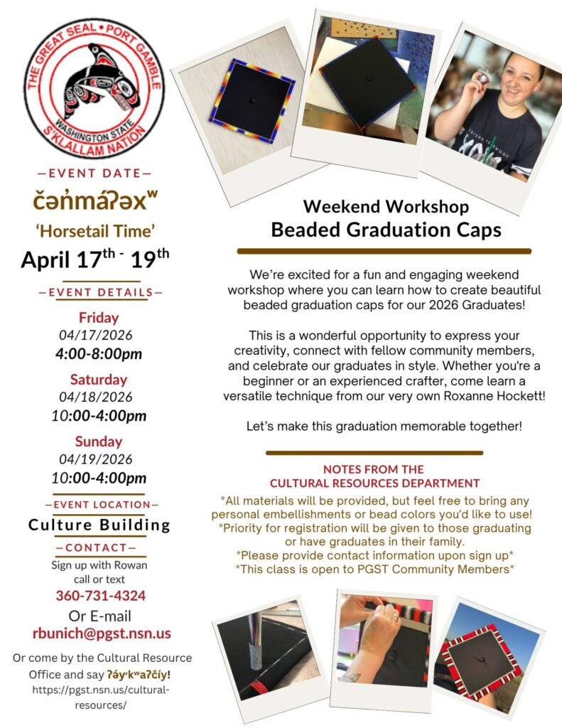 The Cultural Resources Department is hosting a Beaded Graduation Cap Weekend on April 17th – 19th. Join PGST member Roxanne Hockett to learn how to create a beautiful beaded cap, supplies will be provided but you can bring your own also.