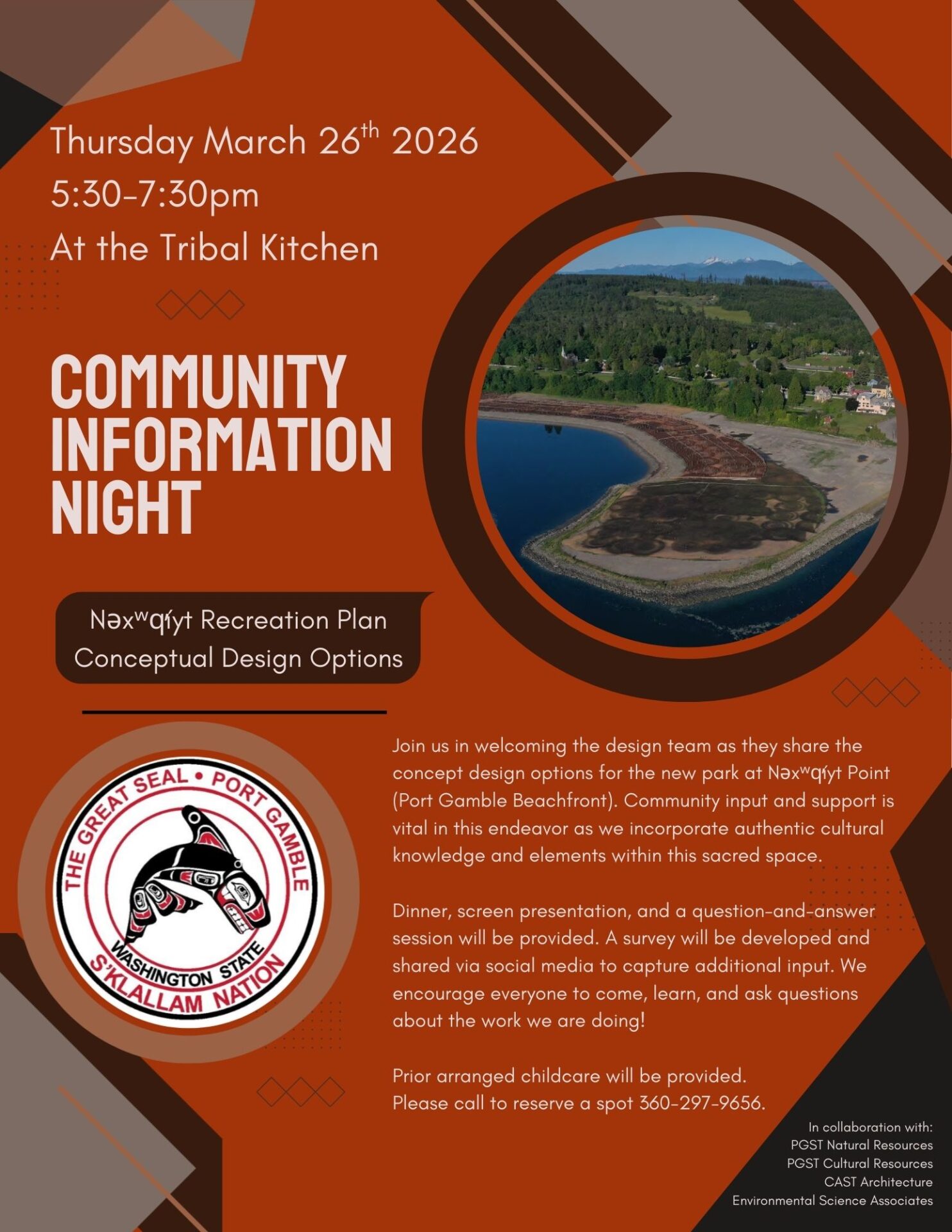 PGST Community Information Night to discuss design options for the new park at Nax™’yt Point (Port Gamble Beachfront) will be on Thursday, March 26th in the Tribal Kitchen. Members are encouraged to attend to enjoy a meal, watch a presentation, and partake in a Q & A.