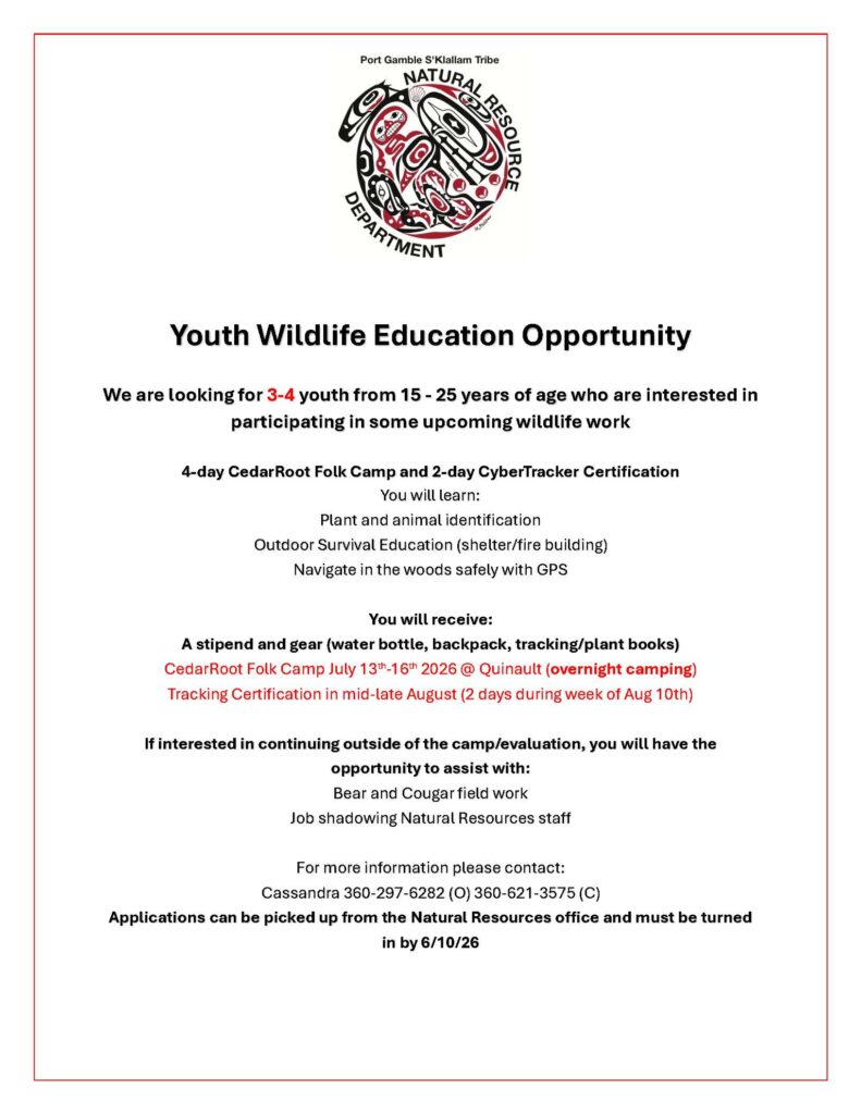 PGST Members ages 15 to 25 the Natural Resources Department is holding upcoming wildlife work and seeking 3 or 4 members to participate. Applications can be picked up from the Natural Resources office and must be turned in by 6/10/26. For more information please contact: Cassandra 360-297-6282 (O) 360-621-3575 (C)